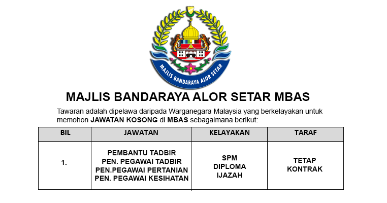 Iklan Kekosongan Jawatan Di Mbas 2020 Portal Rasmi Majlis Bandaraya Alor Setar Mbas